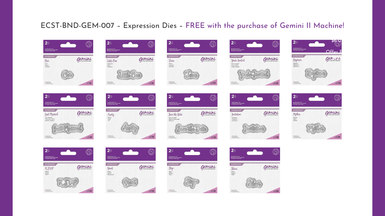 Pre-order a Gemini II machine and receive a FREE exclusive Expressions die bundle (worth almost $100) featuring 14 dies, specially designed for the Gemini II.